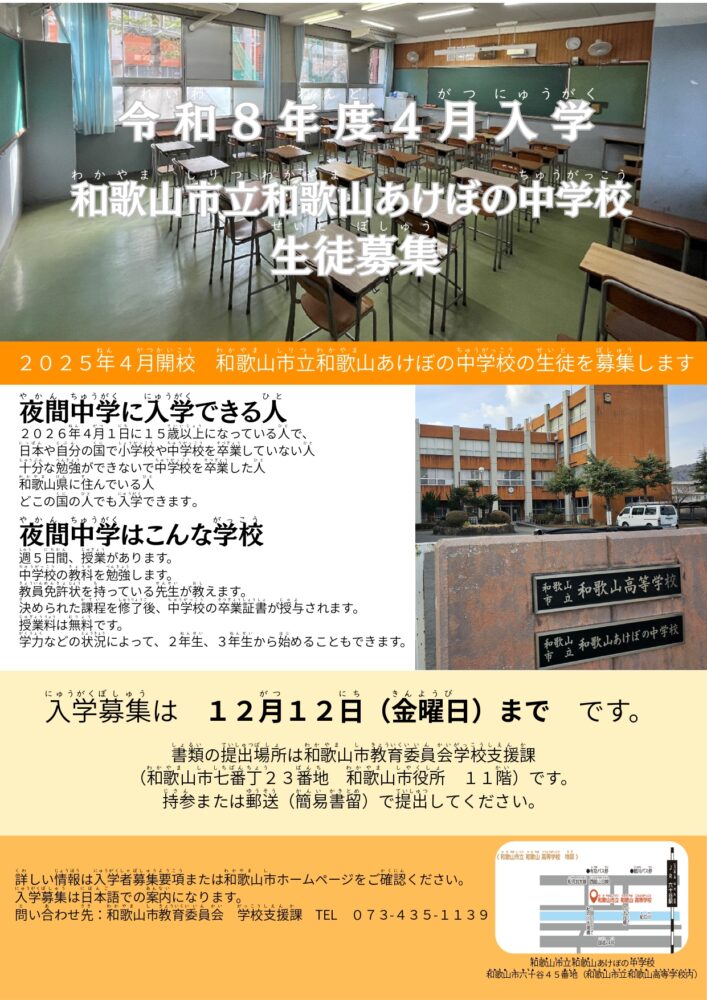 ホーム 令和8年度 入学者募集について 詳しくは生徒の募集についてを参照してください。 所在地 和歌山市立和歌山あけぼの中学校 〒640-8482 和歌山市六十谷45番地(和歌山市立和歌山高等学校内) TEL:073-488-9020 FAX:073-488-9021 ※詳しい地図はこちらを参照してください。 【電車の場合】 JR六十谷駅改札口を出て、西に徒歩10分 【バスの場合】 バス停「鯉川」もしくは「有功」から徒歩5分