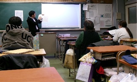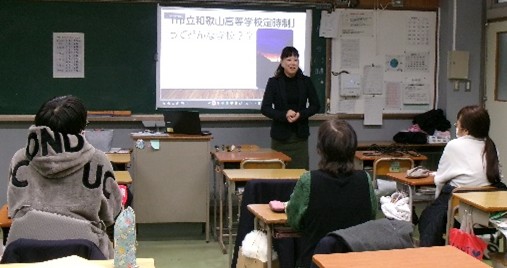 2限目の総合的な学習の時間に、市立和歌山高等学校定時制の先生をお招きし、「学校紹介」と「体験授業」を行いました。学校紹介では、パワーポイントを用いて、市立和歌山高等学校定時制がどのような学校であるかを、わかりやすく丁寧に説明してくださいました。