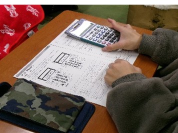 体験授業では、「電卓にふれてみよう」というテーマのもと、電卓の基本的な使い方や、実際の検定で出題される計算問題に挑戦しました。生徒たちは興味深く話に耳を傾け、真剣な表情で取り組んでいました。