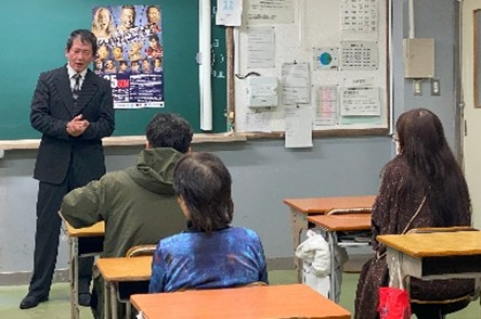| 総合的な学習の時間に、「3代目タイガーマスク」として知られるプロレスラーの金本浩二さんを講師にお招きしました。講演では、「諦めずに挑戦することの大切さ」や「継続は力なり」といった熱いメッセージを届けていただきました。特に「将来につながると思えるなら、物事は続けられる」という言葉に、生徒たちは大きな刺激を受け、自分たちの未来について深く考える貴重な機会となりました。 | ![]() |
