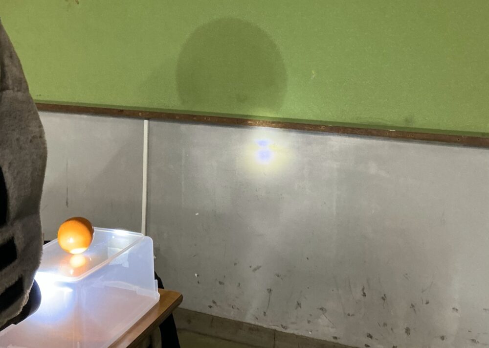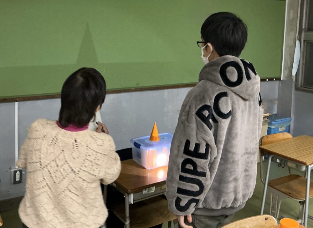 中学1年生の内容を学習する通常課程①コースの数学で、投影図の授業をしました。教室を暗くして、図形にライトの光をあてることで、立面図や平面図の形を視覚的に理解することができました。
