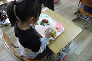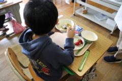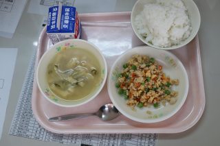 昨日1・2年生が皮むきしてくれたエンドウ豆が今日の献立のそぼろ丼に食材として使われました。