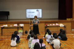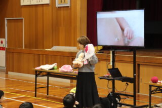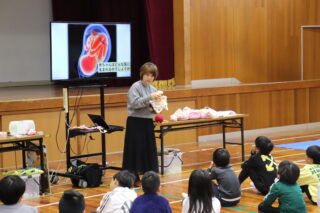 「いのちのたんじょう」の授業 投稿日:2025年10月22日 1年生から6年生まで全校児童が入って、助産師の浜野先生に「いのちのたんじょう」の授業をしてもらいました。おなかの中の赤ちゃんの様子や心音を聞かせてもらったり、妊婦体験をしたり、貴重な時間を過ごすことが出来ました。
