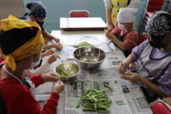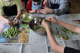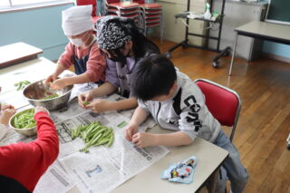 1・2・5・6年生がうすいえんどうの皮むきをしました。5・6年生が1・2年生に皮のむき方を優しく教えてくれていました。皮をむいたうすいえんどうは、給食でいただきます。