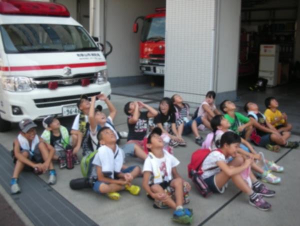 | 9月10日 中消防署見学中消防署に見学に行きました。消防自動車や救急車を見せてもらいました。先生がはしご車にのって見えないところまで高く上がっていました。びっくりしました。 | |