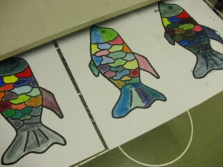 絵の具をつかってみよう 投稿日:2025年10月6日2025年10月7日 水彩絵の具をつかって、お魚に色をつけていきます。 境目の黒い線を気にしながら・・・筆を動かします。 水の量によって、濃淡がおもしろいです。 T「もうできたの?」 C「うん。きれいにぬれたよ!」
