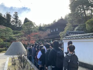 2025 修学旅行1日目⑥ 投稿日:2025年12月9日2025年12月9日 京都に入り、まずは銀閣の拝観です。到着までに小雨がふりましたが、銀閣に着いた時にはやんでいました。 銀閣は華々しさはありませんが、わびさびを感じることができたのではないかと思います。
