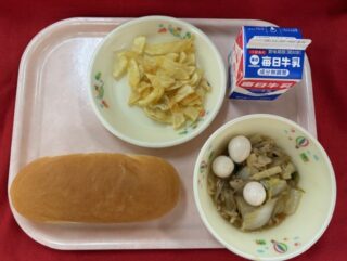給食では豚肉、白菜、うずらたまご、もやし、たけのこ、干しシイタケ、ねぎなどを使いました。