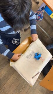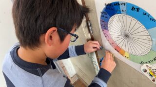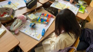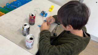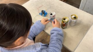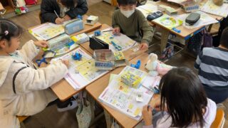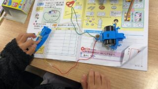 子どもたちは先日の授業で「回路」という言葉を学習しています。電気が輪のように一周することで間にある豆電球が光ります。