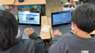 今日の6時間目、5年生の子どもたちは日本の自動車メーカーがどんな願いや工夫をしているのかを、グループに分かれてまとめていました。