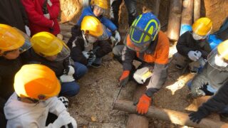 日も差していて思ったより寒くなく、子どもたちは夢中で丸太切り体験に取り組んでいました。