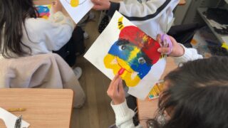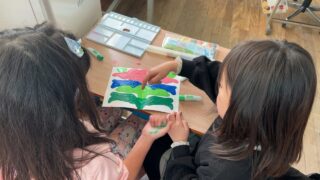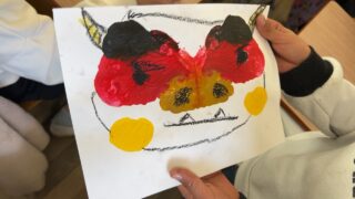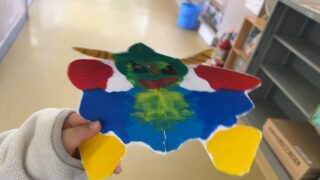 子どもたちは絵の具を塗った画用紙を半分に折り、偶然できた形からオリジナルのおにの顔を見つけていました。