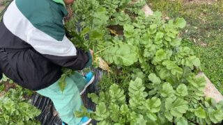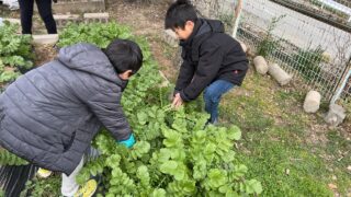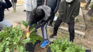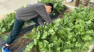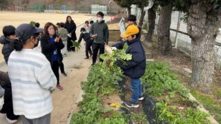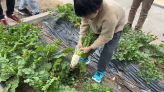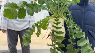 今日の1時間目、なかよし学級の子どもたちは、野菜の師匠である西尾さん夫妻をお迎えしてダイコンの収穫をしていました。