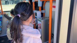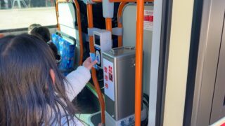 出前教室用にICカードを貸していただいて「ピッ」したり、なかなか押せない「つぎとまります」ボタンを押すことができました。