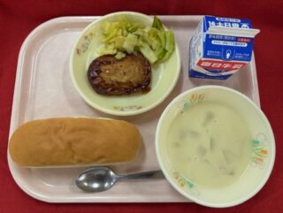 ポタージュスープは豚肉、たまねぎ、じゃがいも、とうもろこし、牛乳などを使いました。