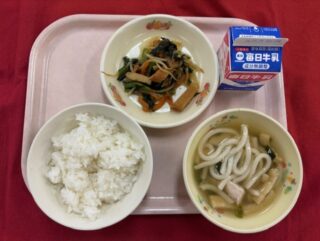 きざみうどんには油揚げの他に鶏肉、かまぼこ、ねぎなどを使いました。