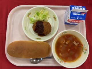 給食ではたまねぎ、白いんげん豆、トマト(缶)、ベーコン、にんじん、マカロニ、じゃがいもなどたくさんの具材を使いました。