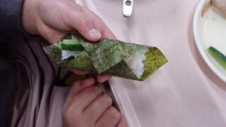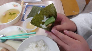 1年生も給食で初めての手巻きおにぎりでしたが、上手に巻いて食べていました。