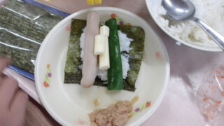 今日は手巻きのりを使って、きゅうり・梅びしお・ウインナー・ツナ・チーズの5種類の具材を自分の好きな組み合わせでごはんと一緒に巻いて食べました。