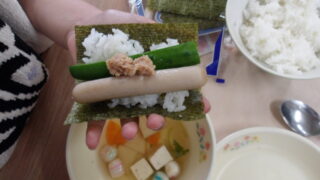 写真は1年と3年生が手巻きおにぎりを作っている時のものです。