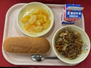 給食では豚肉、うずら卵、キャベツ、もやし、たまねぎ、にんじん、たけのこ、干ししいたけ、しょうが、ねぎを使いました。