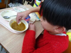 今日の給食 ジビエカレー アチャール は6年生が考えた給食です。