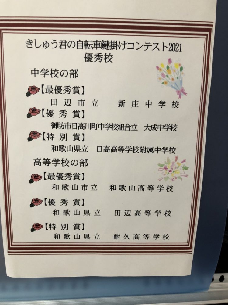 数年前から参加している、和歌山県警本部主催の「自転車鍵掛けコンテスト」にて、昨年度は初の功労賞を受賞し、