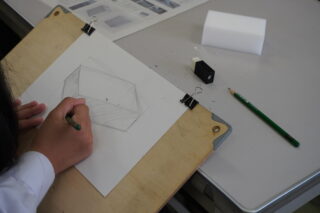 ▼デザイン表現科:実習室で、鉛筆デッサンの実技