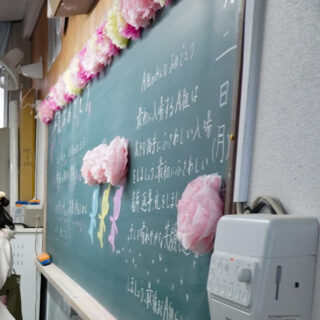 早朝から担任の先生方は黒板にお祝いのメッセージを描き卒業生を迎えました。