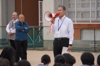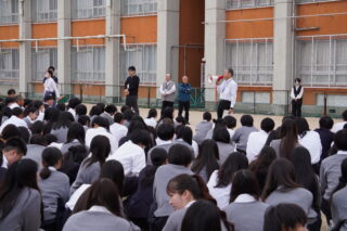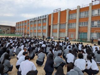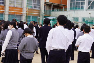 本日7時間目、地震発生のアナウンスのあと、全校生徒がグラウンドに集合しました。