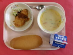 今日の献立は、パン 牛乳 白身魚フライ ほうれんそうクリームシチュー ボイルキャベツ です。