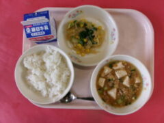 今日の献立は、ごはん 牛乳 マーボ豆腐 はるさめサラダ です。