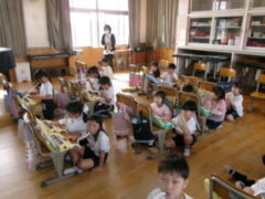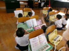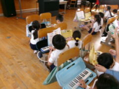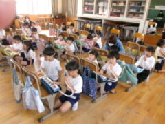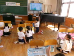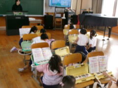 1年生は音楽の学習をしていました。この時間は、けんばんマスターをめざして、けんばんの練習をがんばっていました。こつのポイントは、「⓵トゥトゥトゥ ②ねこの手 ③ゆびはつけたまま ④⓵~⑤のゆびをつかう ⑤てくびをあげる」でした。これらを意識して練習していました。