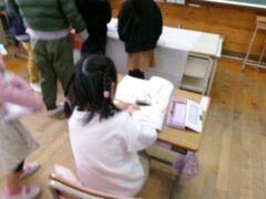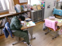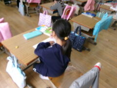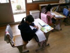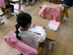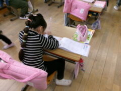 1年生は国語で漢字の学習をしていました。ドリルを仕上げた人は、先生に〇もらっていました。