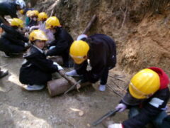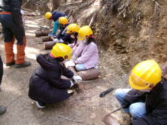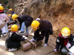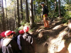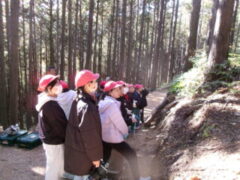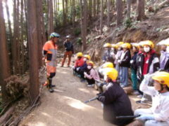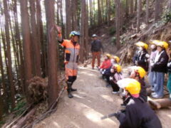 お弁当を食べてから少し休憩した後、またバスに乗って山に向いました。山では、のこぎりの丸太切りと木を切って間伐体験をしました。森林組合の人5名がサポートしてくれました。ヘルメット被り、のこぎりの扱い方を教えて頂きました。いよいよ実体験です。3人一組にになり、一人が丸太の真ん中を押させ、両側で切りました。始めはうまくいかず悪戦苦闘していましたが、少し視ずつうまくなっていきました。切ったものは、小道具で皮を剥きました。杉のいい香りがしてきました。各グループが丸太を切っている間に、斜面を登って間伐の木を伐りにいきました。