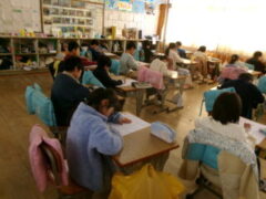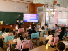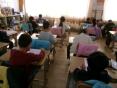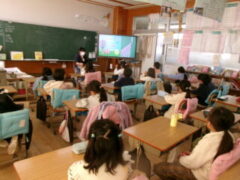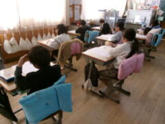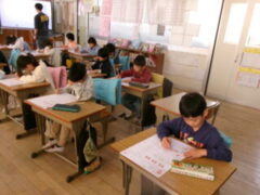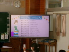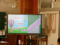 2年生は算数で。アプリの歌で九九の復習をしていました。その後、大きなテストにチャレンジしていました。