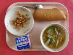 今日の献立は、にんにく団子と野菜スープ フライビーンズ パン 牛乳 です。