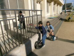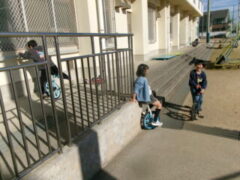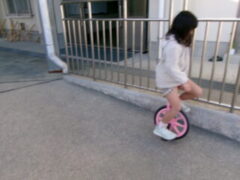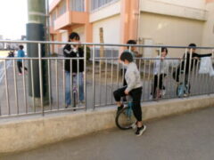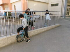 昼休憩に障害物リレー競争を見ていると、『ねえねえ 見て」と声が掛けられました。後ろを見ると一輪車に乗ろうとしていました。「やってみて」と言うと、スロープからスロープへ移動することができました。一輪車で遊んでいるが5~6人いましたが、よく見ると、みんな上手になってきていました。