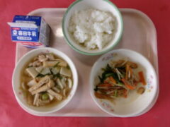 今日の献立は。きざみうどん ひらてんとこまつなのいためもの ごはん 牛乳 です。