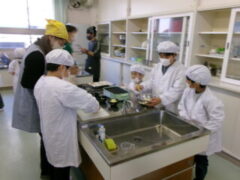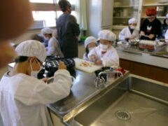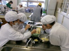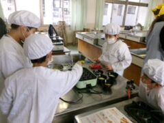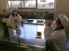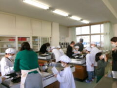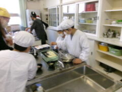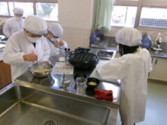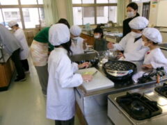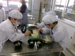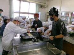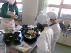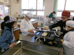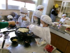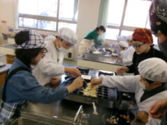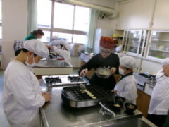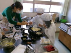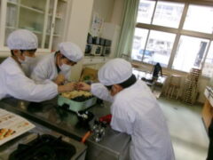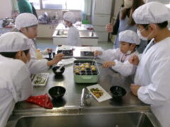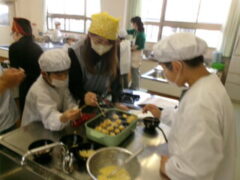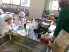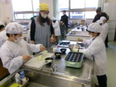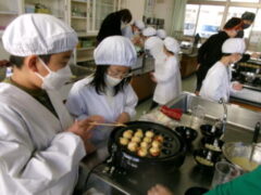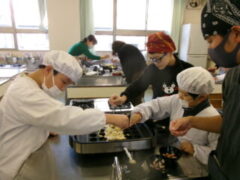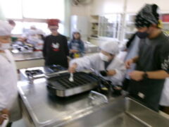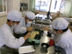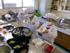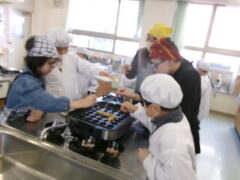 ひまわり学級のお友達は、楽しみにしていたたこやきパーティーをしました。キャベツをきざみ、たこやき粉と混ぜました。そして、鉄板の油をひいて穴に流し込んで焼きました。焼きながらたこやてんかすなど入れました。少しずつ回しながら上手に丸く焼くことができていました。片付けもがんばってみんなおいしそうに食べていました。大きい子がリードしながらみんな頑張っていました。