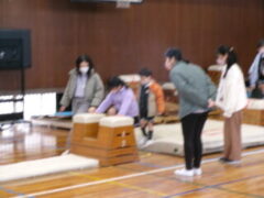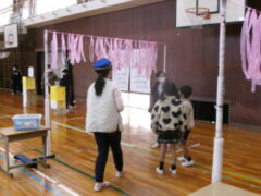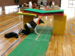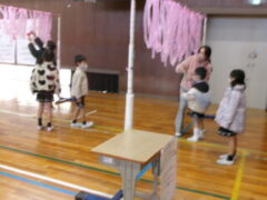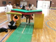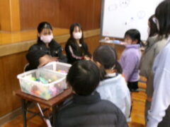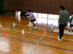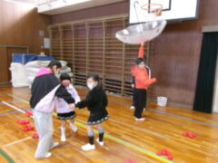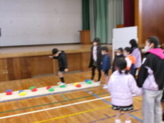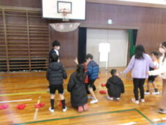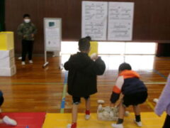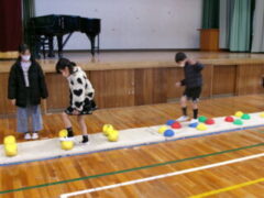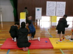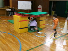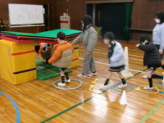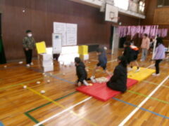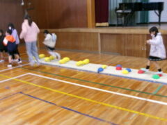 いよいよ交流のプログラムの最後、今福サーキットです。子供たちがサーキットの場のアイディアをだして、先生がそれらの場を繋げて完成しました。跳び箱を使った山、けんけん、トンネル、リラックスルーム、しまわたり、ひもひもトンネル、まとあて、たまいれシュートと工夫された場がたくさんありました。園児たちもいろいろな場を楽しんでいました。5年生もよりやさしく接してサポートしていました。