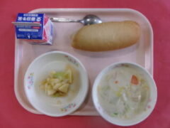 今日の献立は、パン 牛乳 白菜のクリーム煮 リンゴサラダ です。