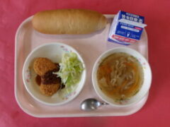 今日の献立は、しろはなまめコロッケ ボイルキャベツ オニオンスープ パン 牛乳 です。