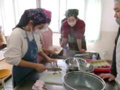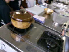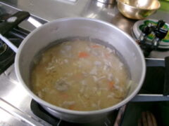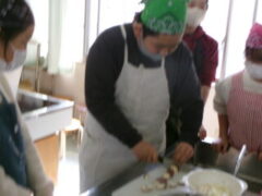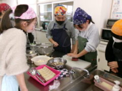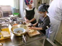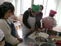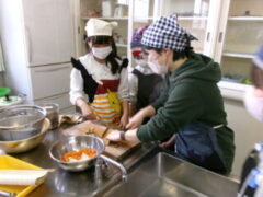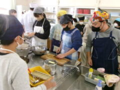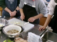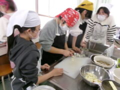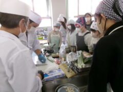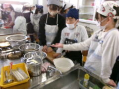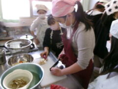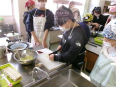 5・6年生は、和歌山県調理師会の事業で「キッズシェフ体験」をしました。まず、和歌や名の食材梅豚汁を作りました。にんじん、だいこん、さつまいも、白ネギ、ごぼうなどの食材を順番に切って行きました。あらかじめ誰が何をきるか決めていたのでスムーズに調理が進んでいました。