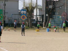 5年生は体育でティーボールに取り組んでいました。置いてあるボールでも当てることはむずかしですが、頑張って打っていました。