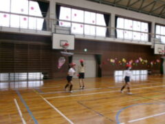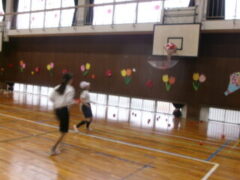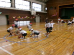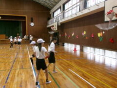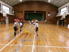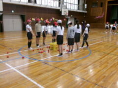 5年生は体育でからだほぐしの運動していあmした。紅白に分かれて玉をかさに入れて競っていました。