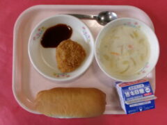 今日の献立は、パン 牛乳 ふかフライ ポタージュスープ です。