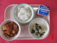 今日の献立は、ごはん 牛乳 おでん 酢の物です。