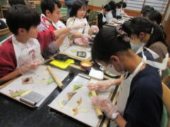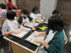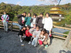 2日目、一番目のプログラムは、八つ橋づくりでした。みんな集中して上手に作っていました。持って帰りますので、食べてみてください。次は金閣寺に向っています。