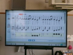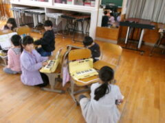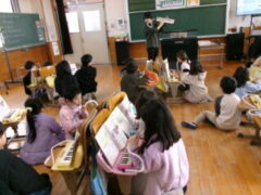 2年生は音楽で歌の練習した後、ピアニカの練習に取り組みました。先生から指の押さえ方を教えてもらってました。